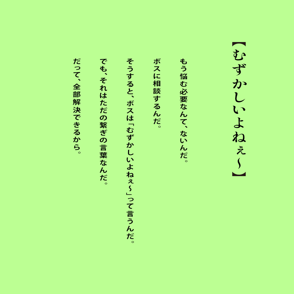 LOBJETボス語録#9もう悩まない。イラスト:Dごさん今日を力強く生きるためのヒントがあるかもしれない、「ボス語録」!今回は、前回と合わせて聞いてほしい。↓クリック!難しく考えることはない。前回はこちらから!↓ボス語録♯8