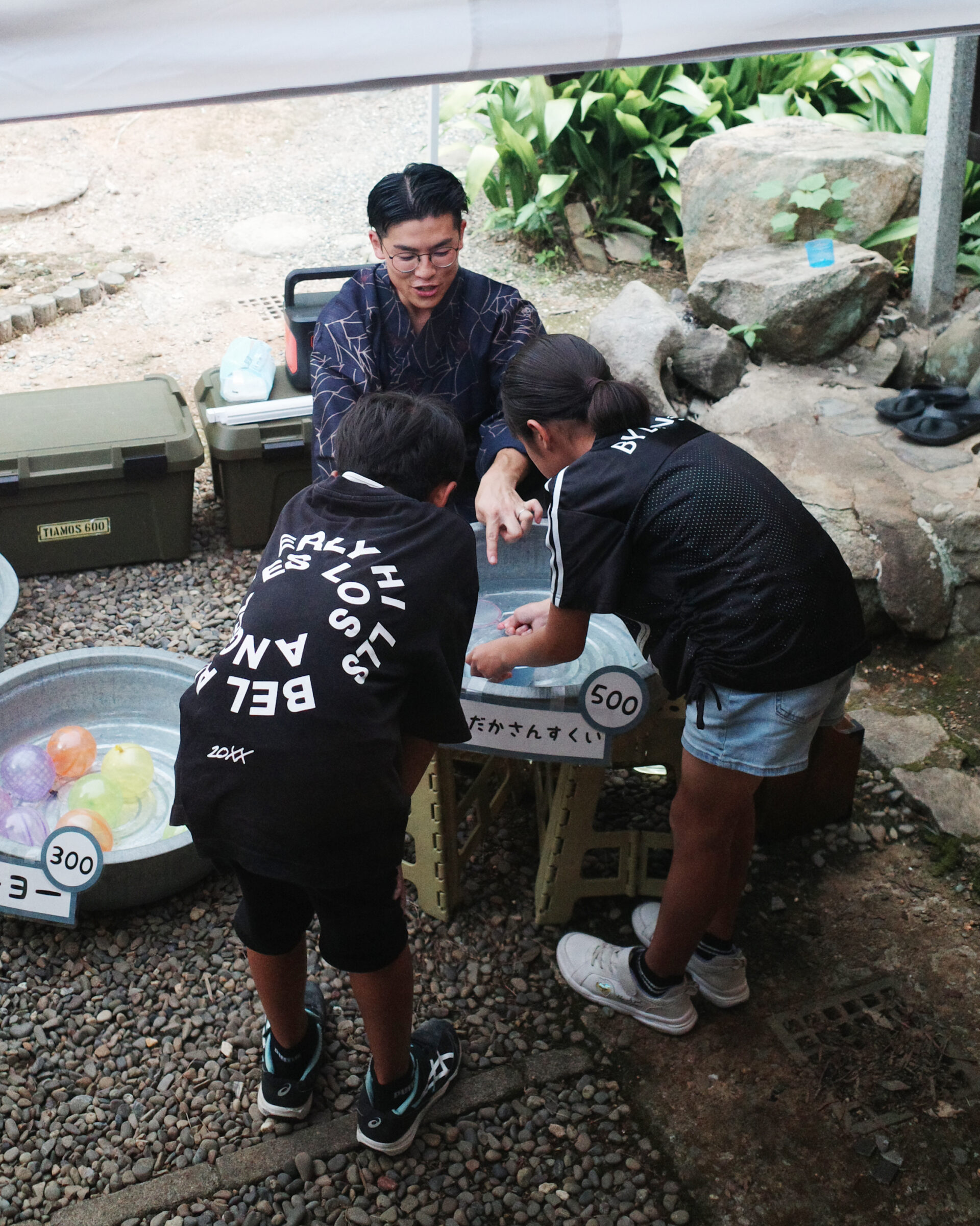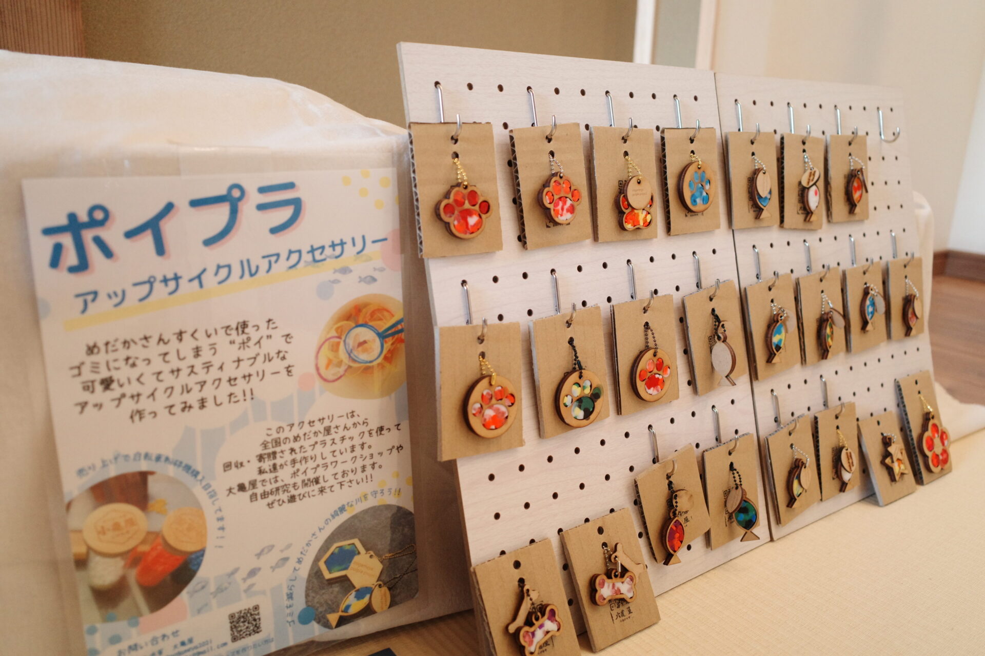- メダカ屋さん(大亀屋) → 定番のめだか掬い+ポイを再利用したキーホルダー作り✨